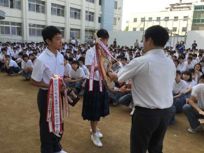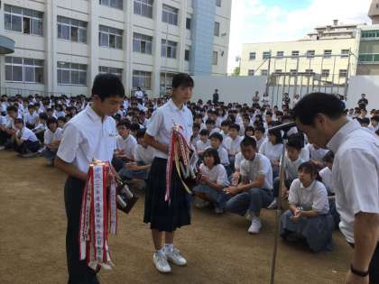 9月17日の全校集会前に、夏季休業中に受領した部活動表彰の披露が行われました。