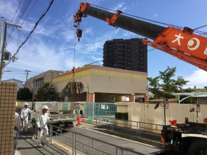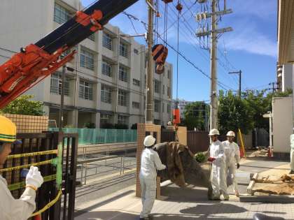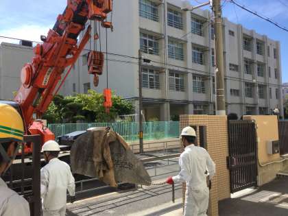 クレーンで吊り上げられた記念碑「心」は、運転手の巧みなアームさばきでゆっくりと正門を通過していきました。道路上で待っているトラックに慎重に乗せらて移動となりました。