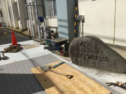 新しい設置場所は1号館を背にした小脇門の正面です。小脇門からも正門から、深く掘られた文字「心」「創立50周年記念」がよく見える位置に鎮座しました。