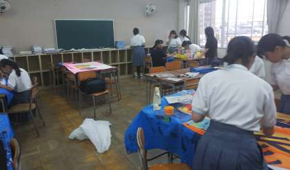 3年生は放課後を利用して学級旗を作成し、まもなく全クラス完成です。各クラスのはちまきの色をベースにしていますが、『色』以上に各クラスのクラスカラーがでている作品揃いです。