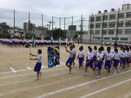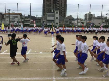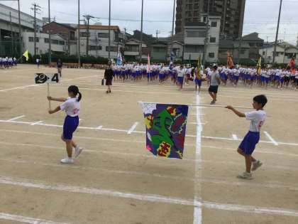 朝礼台の前では、プラカードを90度回転させてクラス名を本部席側に向けています。同じく学級旗を地面に対して平行にして高く掲げて、絵柄がよく見えるようにしての行進でした。