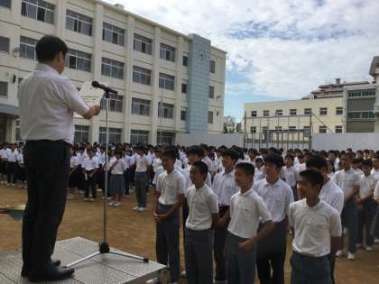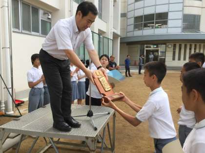 団体優勝の表彰の後にも、シングルスやダブルスの披露があり、多数の生徒が朝礼台前に並んで校長先生から表彰状や楯、メダルが授与されました。