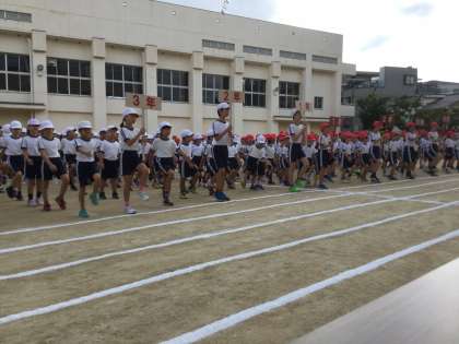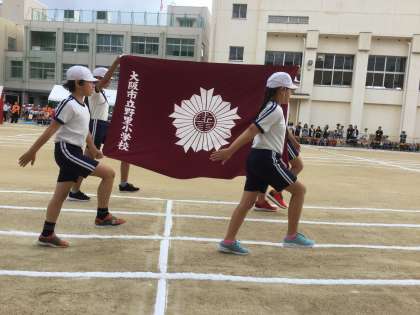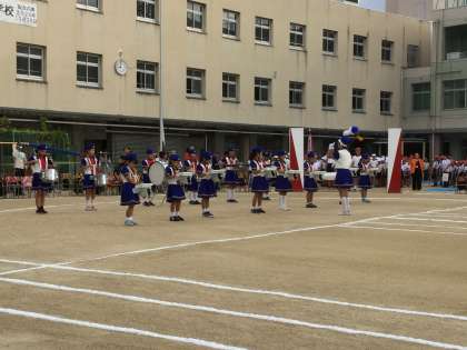 鼓笛隊の音楽に合わせて、児童会による旗を先頭に、6年生から順に入場行進です。