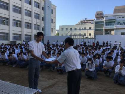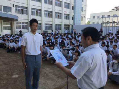 同時に、3年生の内野大地君が、JOCジュニアオリンピックカップ第33回全国都道府県対抗中学バレーボール大会の選抜選手に選出されたことを証する、日本バレーボール協会の認定証の披露も行われました。