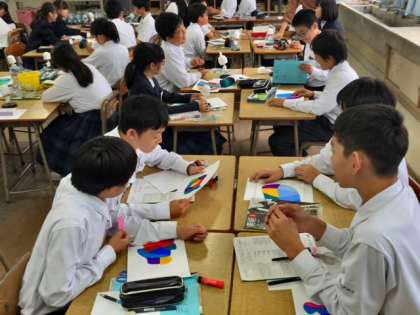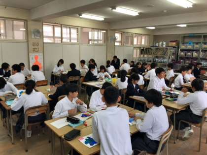 1年生の美術では、完成した色彩の作品をグループで鑑賞を行なっています。