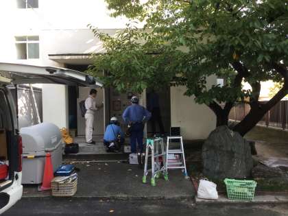 旧正門脇の電気室をはじめとした、校内各所の電気設備の点検作業が行われました。。校内のすべての電気が止まり、水道ポンプも止まりトイレ等の施設も機能が停止しました。
