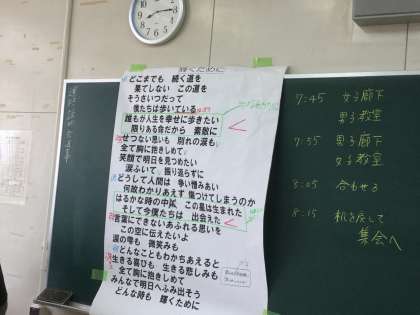 黒板には、3年生の課題曲「輝くために」と4組の自由曲「旅立ちの日に」の説明付きの拡大した歌詞が掲示されていました。