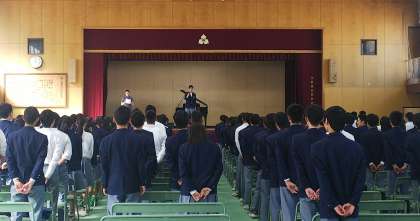 始めに泊先生から、入退場の方法などについて話を聞いた後、各クラスが出場順に実際に舞台に上がりました。