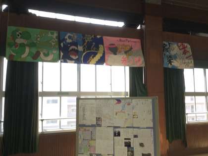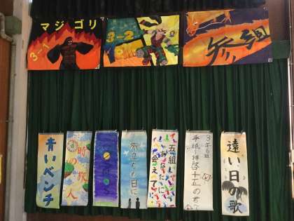 3年学級旗と、文化発表会で各クラスの自由曲をお知らせしためくりです。