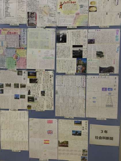 学級旗の下のパネルに展示されているのは、3年生が夏休みの宿題で制作した社会科新聞です。