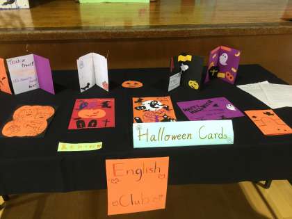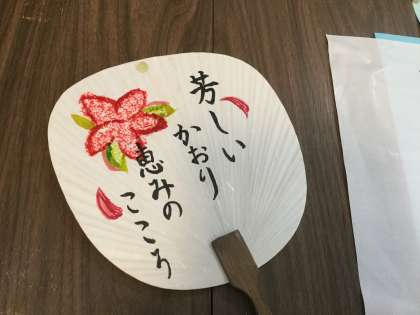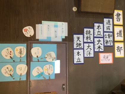 書道部の作品は半紙に書いたものや、うちわには涼しげな絵が添えられた作品の展示でした。