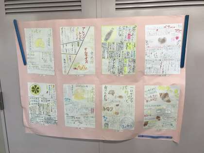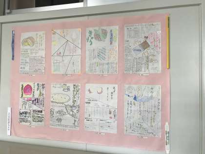 1年生のフロアでは国語の授業で作成した「食感のオノマトペ」のパンフレットが掲示されています。