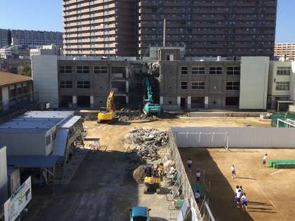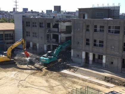 4号館中央部の壁面に大きなツメを精一杯開いて、壁に柱に食いつきかみ砕いていきました。あっという間にコンクリートは粉々になって落下、すぐに廊下や教室内部が見えるようになりました。