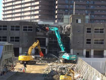 長いアームを伸ばしては解体が進み、コンクリートの破片が積みあがっていきました。
