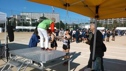 最初の競技は、中学校対抗リレーです。女子・男子の順に行いました。1人200メートルの6人でのリレーです。今年は、男女とも、陸上部6人ずつで出場しました。