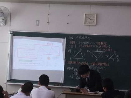 授業では液晶プロジェクターとタブレットを組み合わせて図形が映し出されていました。三角形の図形にタッチペンで赤色の文字を書き加えて説明されていました。黒板の文字と映像がうまくマッチした授業でした。