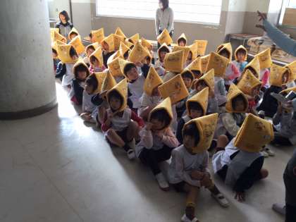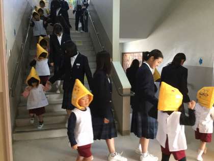 津波も収まり避難が終了し、階段を下りグランドへ向かうことに。野里幼稚園の園児たちは、のぼりの時と同じく、1年6組・7組の男女の生徒に、手をつないでもらい降りてきました。中学生たちはかわいいと言いながら、やさしくリードしていました。