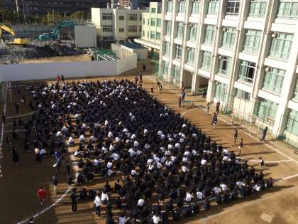 避難を終了して園児は幼稚園に戻り、生徒はグランドに整列しました。