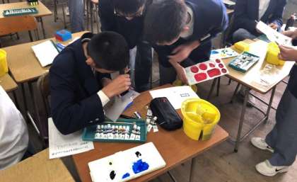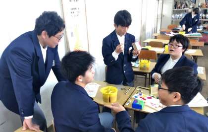「思い出のステンシル小箱」というテーマで制作しています。ステンシルシートを使って小箱に転写をしているところで、仕上がる様子をみんなでじっと見つめています。