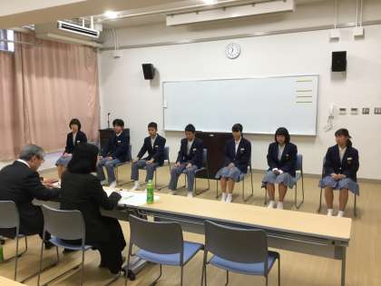 高校入試で面接を担当されておられる先生方にお越しいただき、入試時同様に面接していただきます。今日は、1組と4組が、6〜7人が一つのグループになり練習しました。