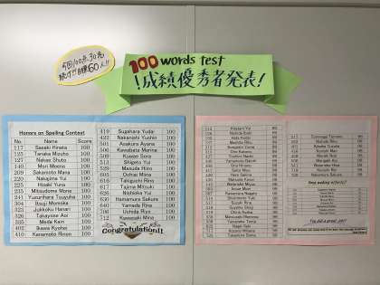 1年生のフロアに、先日行いました「英単語100問テスト」の成績優秀者を発表しています。