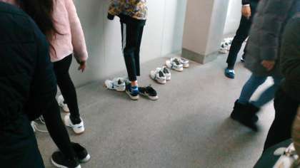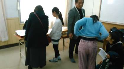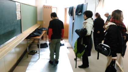 隣の部屋では、標準服の採寸を行っています。男子は、手前の入口から、女子は、奥の入口から入って下さい。