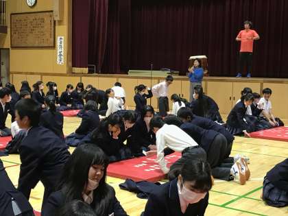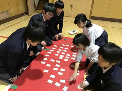 1月29日に1年生の百人一首大会を行いました。この日までできるだけ多くの上の句を覚え、早く札を取ろうと努力している生徒もたくさんいました。当日の、今日は各畳に各クラスから1人ずつ同じくらいの実力を持った生徒が集まり、熱い戦いを繰り広げました。クラスに1枚でも多く貢献しようと一生懸命な姿が印象的でした。結果はどうだったのでしょうか?