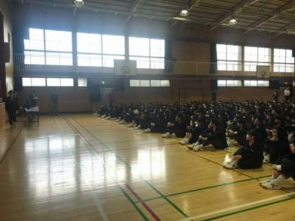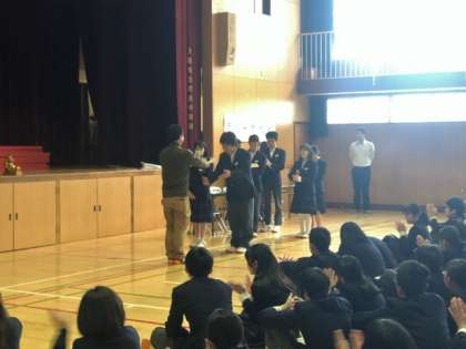 閉会式の様子です。国語科の先生の講評では、昨年に比べて、札を取ってその後の切り替えがとても早くなった。委員の人たちが準備からとてもよく頑張ってくれていたし、みんなが周りを思いやって楽しむことができた百人一首になったとお話いただきました。