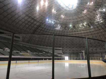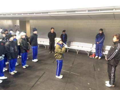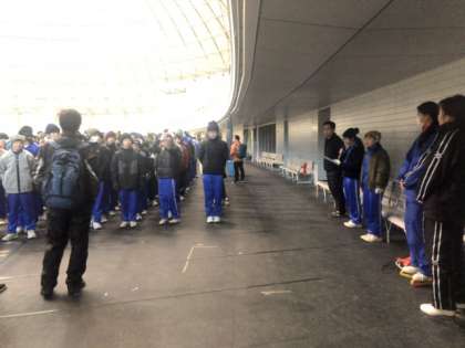 会場に到着しました。代表生徒から施設スタッフの方へのあいさつ、そしてスタッフの方からの諸注意が行われています。