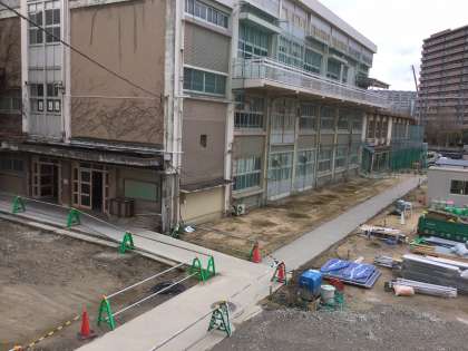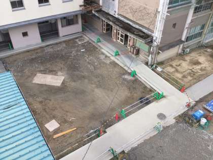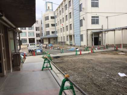 現地に残っているのは、地面のコンクリートとアスファルト通路のみとなり、鉄パイプ製バリケードで囲われていました。今まで見通しの悪かった場所が、校内各所より工事前と同じように見渡せるようになりました。