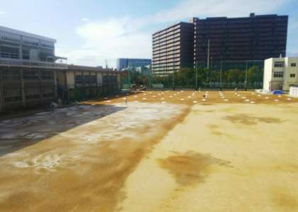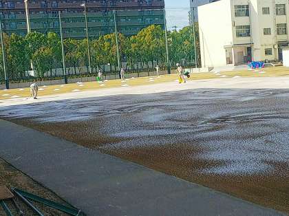 3日(火)の午後、グラウンド整備中の第1グラウンドで、にがりまきが行われました。授業再開時に、安全に快適に使用できるように準備をすすめられています。