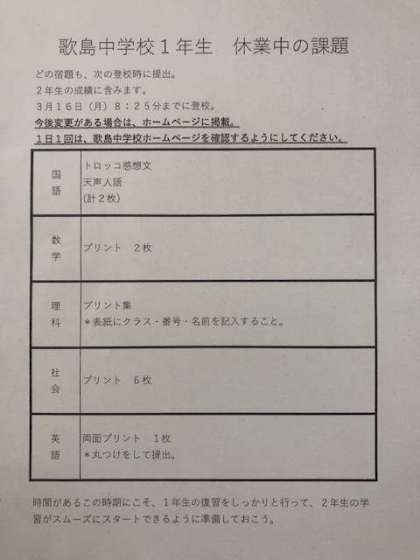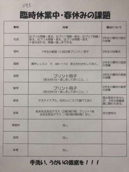 本日と明日にかけて、家庭訪問を行なっています。1、2年生は課題プリントを配付しています。