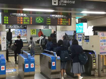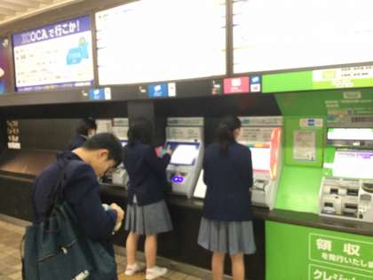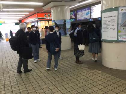 生徒達は7時頃から駅にやってきては、先生の周りに集まって会話を交わしていました。切符購入後同一方向の友を誘いながら改札口をとおり、試験会場の高校へと向かっていきました。 昨日からの雨もなく、晴天で穏やかな陽気のもとでの出発となりました。