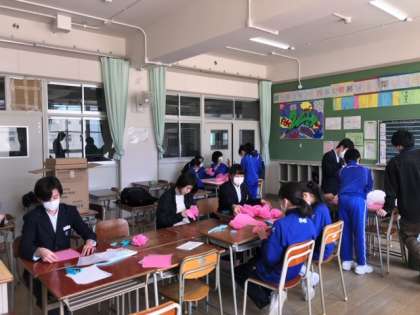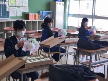 本日生徒会で集まり、卒業式に向けての準備を行いました。卒業生に当日胸に着けてもらうコサージュの花束、そして卒業生に向けての花文字を作成しました。
