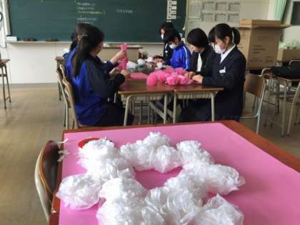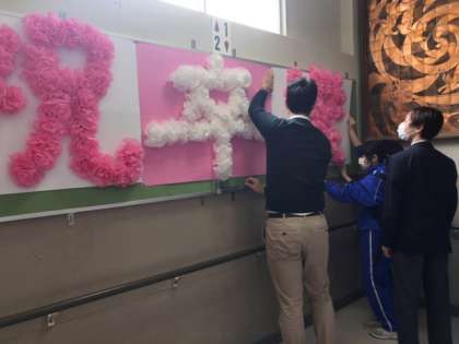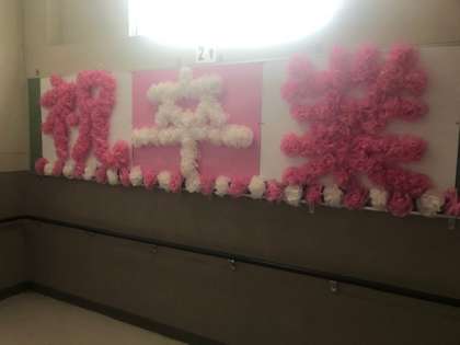 生徒会役員と有志のメンバーでおはながみを使った花文字を制作し、卒業生が通る階段の掲示板に飾りました。