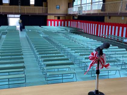 4月2日(木)の午前中に部活動生徒の協力を得て、明日の入学式に向けて会場の設営を行いました。午後には舞台の盛花も活けられ、体育館は静かに明日の式典を待っています。