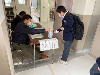 各学年入り口の廊下では、マスクを着用した先生のもと手指をアルコール消毒していました。
