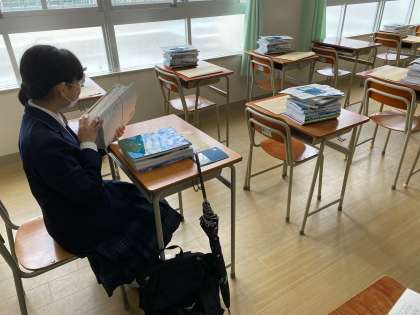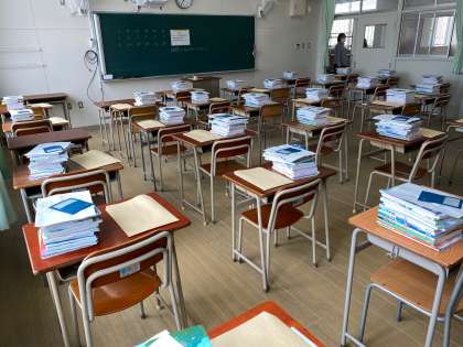 受け取った生徒たちは、真新しいインクのにおいのする教科書をはじめとする配布物の確認を丁寧にしていました。