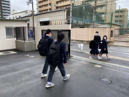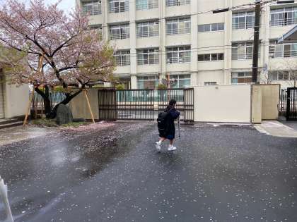 どの生徒も膨らんだカバンを背負っての下校でした。昨夜のあらしで花びらを落とした旧正門横のさくらを眺めながら、生徒たちは家路を急いで2号門へ向かっていました。