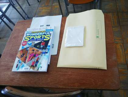 前回の登校時にお渡しした課題を受け取り、新たな課題を配付しました。写真は1年生の配付物です。政府からのマスクや、大阪府からの図書カードも配付しました。下校時に英検受検を希望する人の申し込みを受け付けました。
