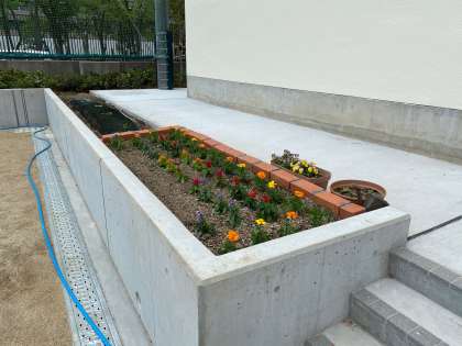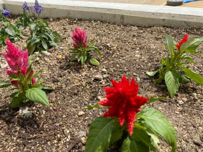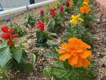 5号館脇の特別支援学級の花壇では、色とりどりの花が咲いています。