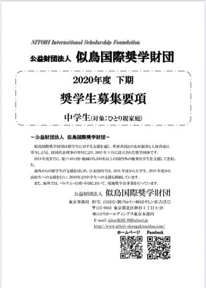 本日、似鳥国際奨学財団より奨学生募集の案内が届きました。詳しくは下記をご覧ください。