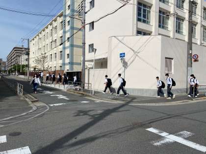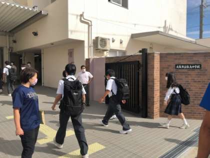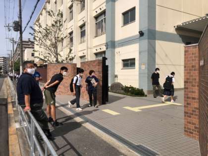 本日から全学年の分散登校が行われ、出席番号前半のグループが登校しています。たくさんの先生たちに見守られながら正門を通っていきます。