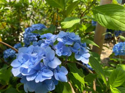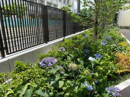 登下校の生徒が通る1号館の道路側の植え込みで、あじさいの花が見ごろを迎えています。青紫色の花びらをたくさんつけた大きなアジサイが、太陽の光をいっぱい浴びて立体的な陰影が見事です。