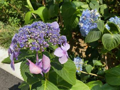 またガクアジサイは、中心につぼみのような小さな紫色の花がたくさんかたまり、その外側に赤紫色のちょうちょの羽のようなガクがついて、まさに額縁のような華やかさを演出しています。