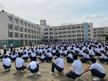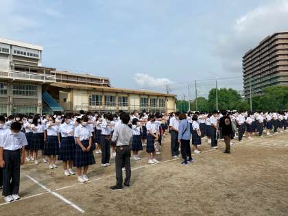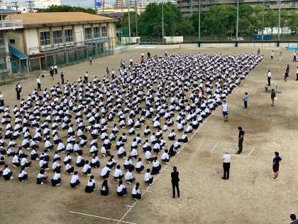 登校してすぐ第1グラウンドに集合です。今までと違い整列時に生徒同士の距離を取り、800人がグラウンドいっぱいに広がっての整列でした。