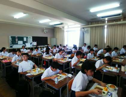 1年生は小学校の時の経験もあり、当番の活動をてきぱきとできています。全員前を向いたままで食べています。