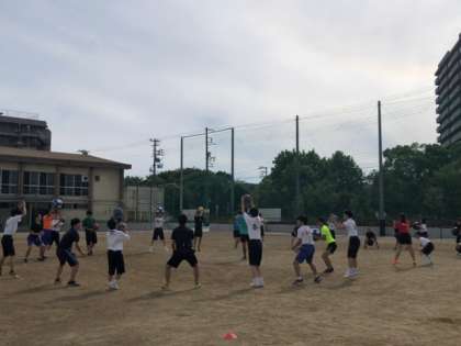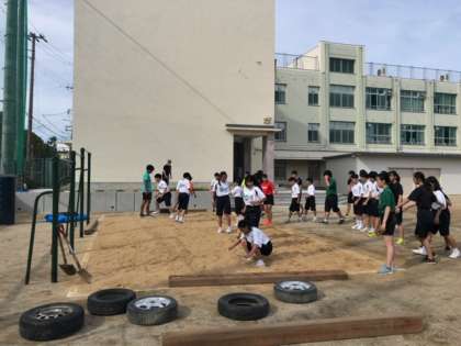 陸上競技部の様子です。ダイナミックボールやメディシンボールを使ったトレーニングのあと、砂場を使って立ち幅跳びの練習をしています。