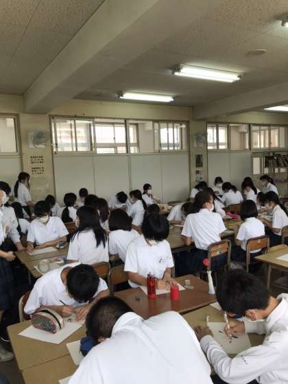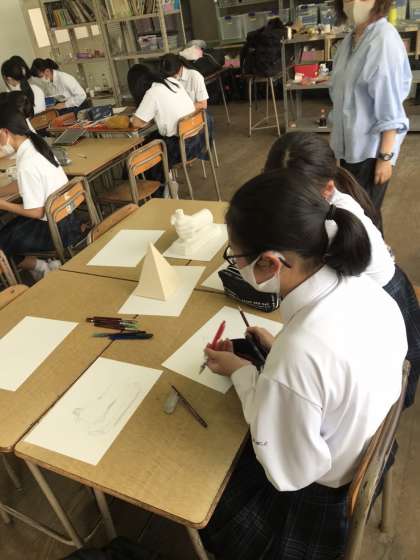 美術部の体験入部の様子です。先輩が考えたワークショップを体験しています。ぬり絵やデッサン、シール作りなどそれぞれに活動していました。