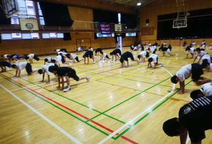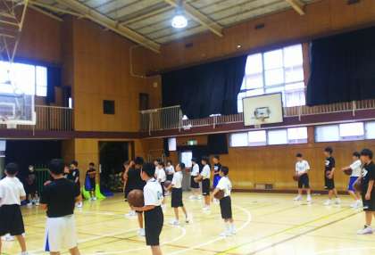 男子バスケットボール部の様子です。ジャンプを主体にした体力づくりをしたり、ボールを使ってドリブルの練習をしました。先輩の動きについていこうと、1年生もがんばっていました。